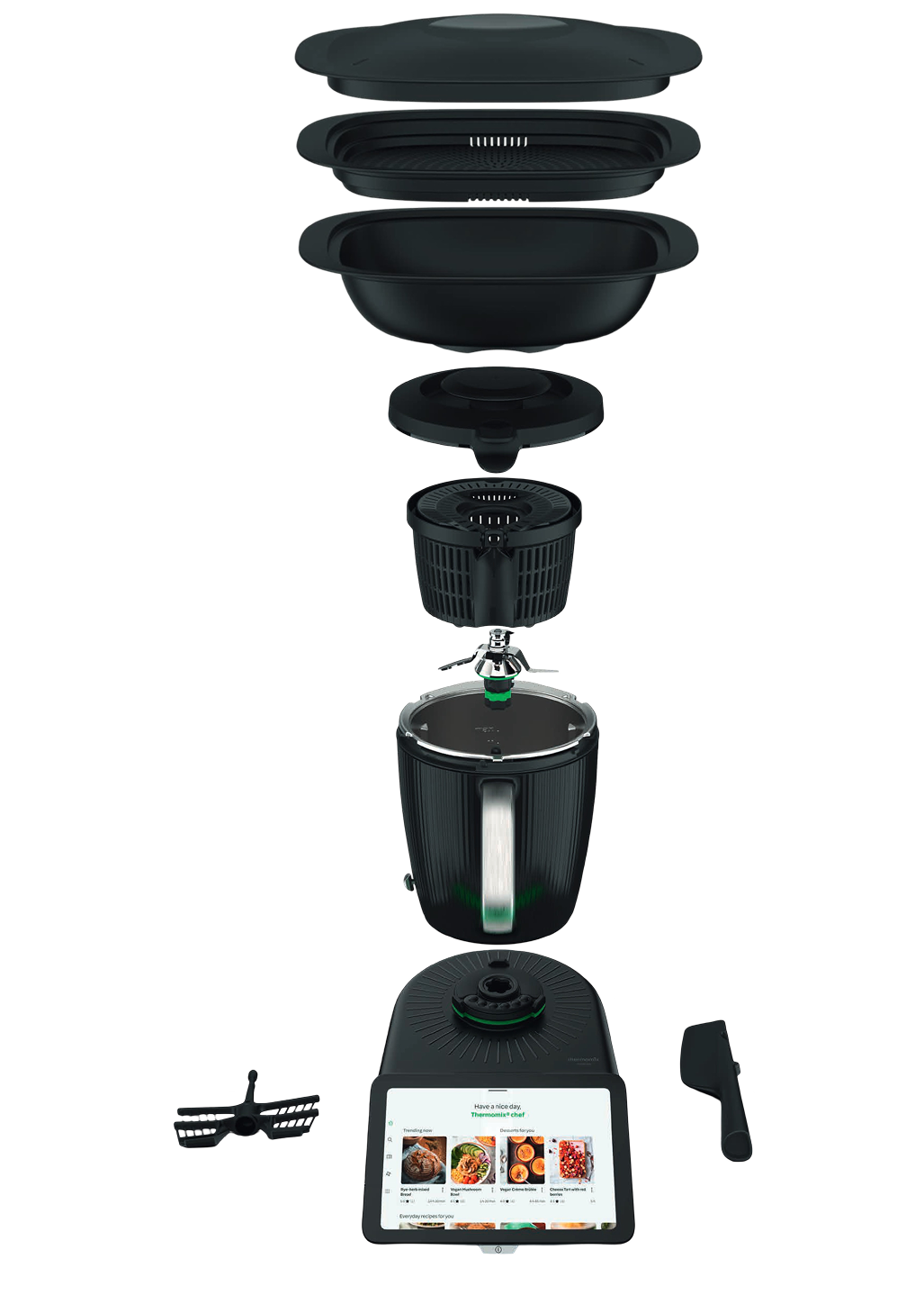 Thermomix TM7, estetik ve fonksiyonelliği bir araya getiren modern siyah tasarımıyla dikkat çekiyor. Önceki modellerden farklı olarak TM7, 10 inç büyüklüğündeki yüksek çözünürlüklü dokunmatik ekranı sayesinde daha sezgisel bir kullanım sunuyor. Tablet benzeri bu ekran, tarifleri takip etmeyi ve cihazı yönetmeyi çok daha kolay hale getiriyor.